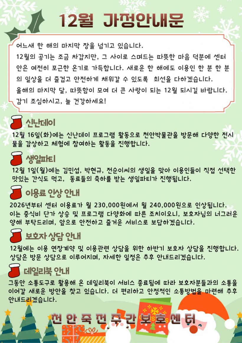 2025년 12월 가정안내문 페이지 정보 작성자 김미리 작성일25-11-28 15:20 조회192회 댓글0건 이전글 다음글 목록 본문 12월 가정안내문 입니다. 댓글목록 등록된 댓글이 없습니다. 이전글 다음글 목록