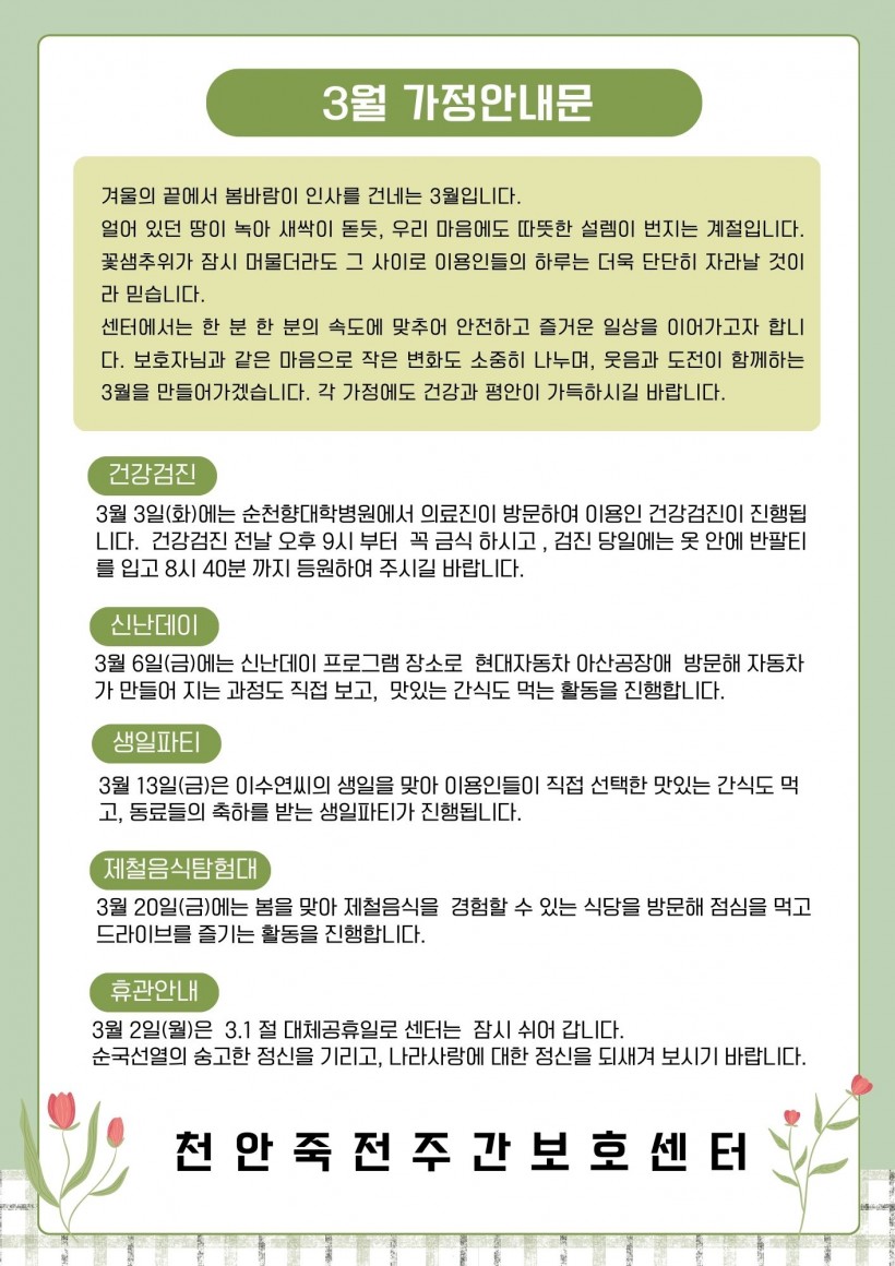 2026년 3월 가정안내문 페이지 정보 작성자 김미리 작성일26-02-26 08:22 조회9회 댓글0건 다음글 목록 본문 3월 가정안내문입니다. 댓글목록 등록된 댓글이 없습니다. 다음글 목록