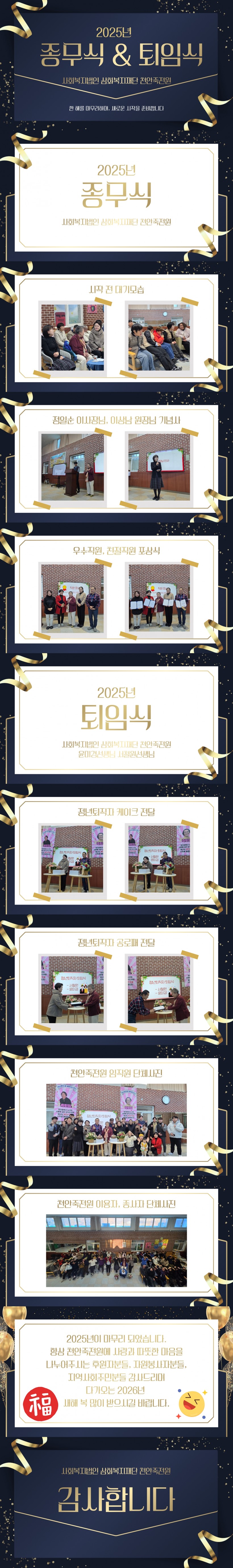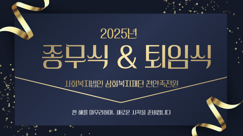 2025년 사회복지법인 삼화복지재단 천안죽전원 종무식 & 퇴임식 페이지 정보 작성자 운영자 작성일25-12-31 13:33 조회400회 댓글0건 관련링크 목록 본문 2025년 사회복지법인 삼화복지재단 천안죽전원 종무식 & 퇴임식을 진행하였습니다.항상 천안죽전원 가족분들의 얼굴에 웃음꽃이 활짝 피실 수 있는 죽전원이 되겠습니다!다가오는 2026년 새해 복 많이 받으세요!감사합니다. 댓글목록 등록된 댓글이 없습니다. 목록