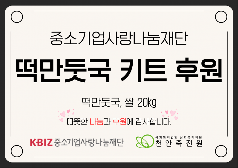 중소기업사랑나눔재단 떡만둣국키트, 쌀 후원 페이지 정보 작성자 운영자 작성일26-02-05 13:45 조회199회 댓글0건 관련링크 목록 본문 26.01.28.(수)중소기업사랑나눔재단 떡만둣국키트, 쌀 후원해주셨습니다.가족분들도 환하게 웃으시면서 맛있게 식사 하셨습니다.천안죽전원에게 사랑과 나눔을 해주신 중소기업사랑나눔재단에게 다시한번 감사의 말씀을 드립니다.감사합니다. 댓글목록 등록된 댓글이 없습니다. 목록