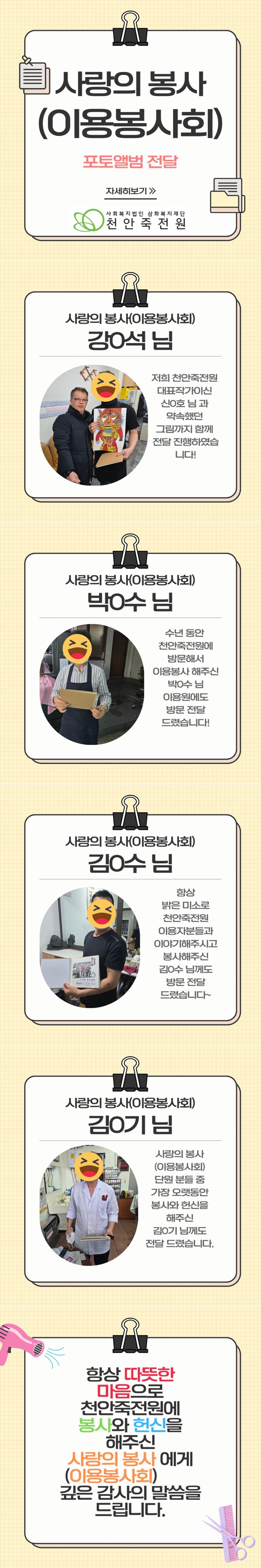 저희 법인이 세워질 때 부터 방문해주셔 봉사활동을 진행한 사랑의 봉사(이용봉사회)가 1월을 마지막으로 봉사활동을 종료하였습니다.