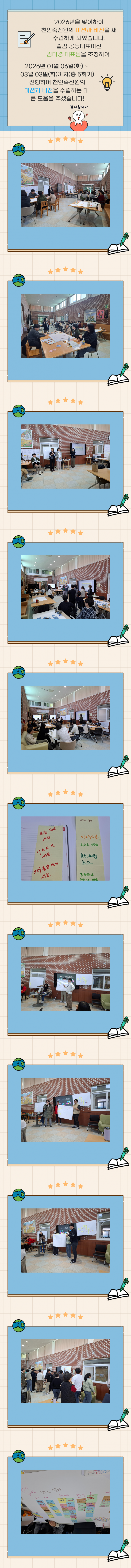 미션&비전 교육 페이지 정보 작성자 운영자 작성일26-03-16 16:16 조회24회 댓글0건 관련링크 목록 본문 2026년 01월06일 부터 03월 03일까지 미션,비전 교육 진행하였습니다.기관에 대한 정체성과 직원분들의 장점, 업무적인 시너지들을 알 수 있는 좋은 시간이였습니다. 댓글목록 등록된 댓글이 없습니다. 목록