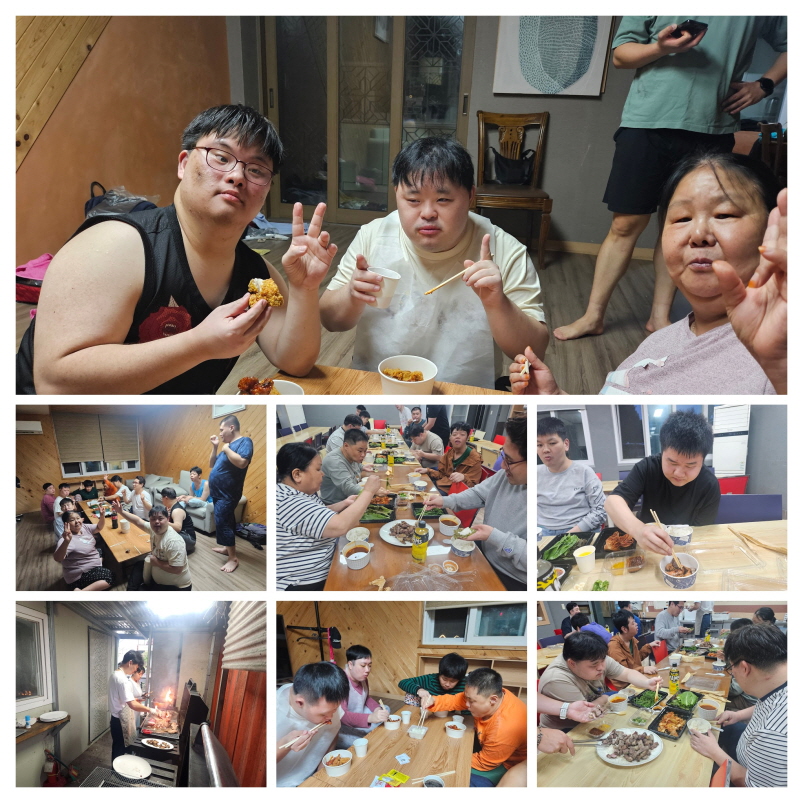 지글지글 숯불 위 고기 냄새가 캠프장 가득 퍼지고, 고기를 먹으며 엄지척! 하는 모습을 보이며 만족해 하는 모습을 보였고, 하루의 마무리는 역시 치킨이죠~!! 편안한 복장으로 즐기는 야식 타임은 소소한 행복을 느끼게 해주는 시간이었습니다.