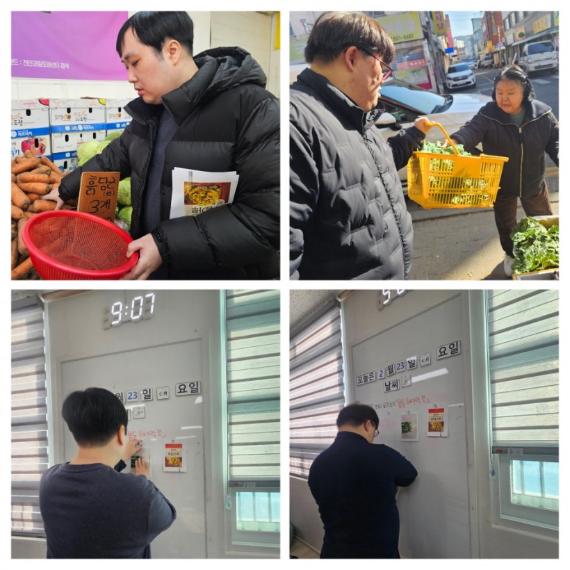활동에 앞서 이용인들은 ‘내가 사고 싶은 재료’를 사진으로 직접 골라보며 장보기 계획을 세웠습니다. 이후 시장으로 이동해 선택한 재료를 하나하나 찾아 구입하며, 물건을 고르고 계산하는 경험도 해보았습니다.